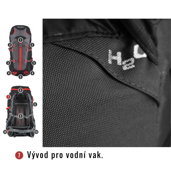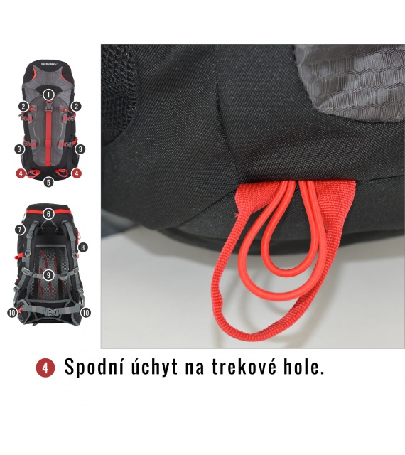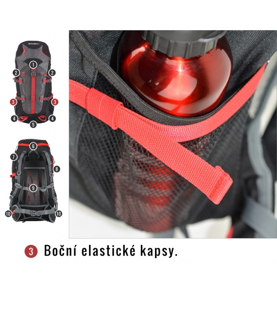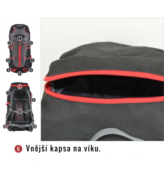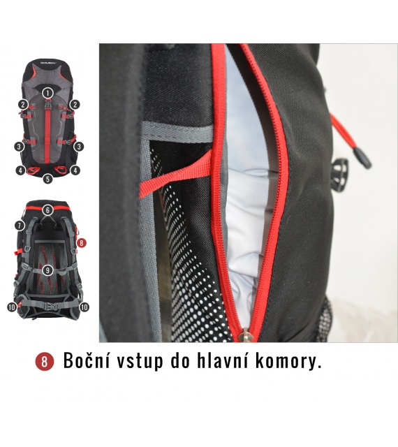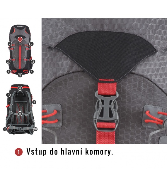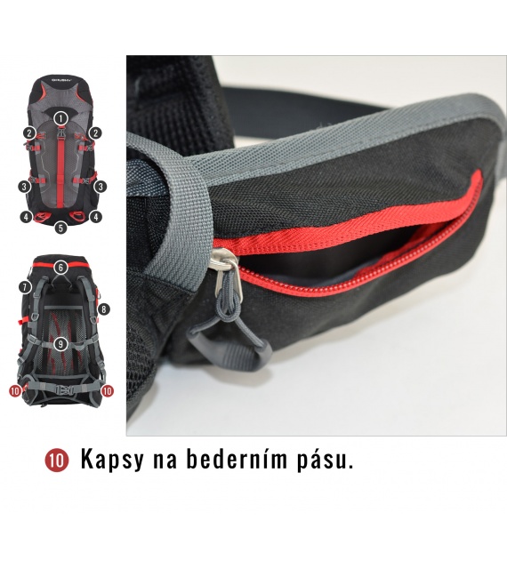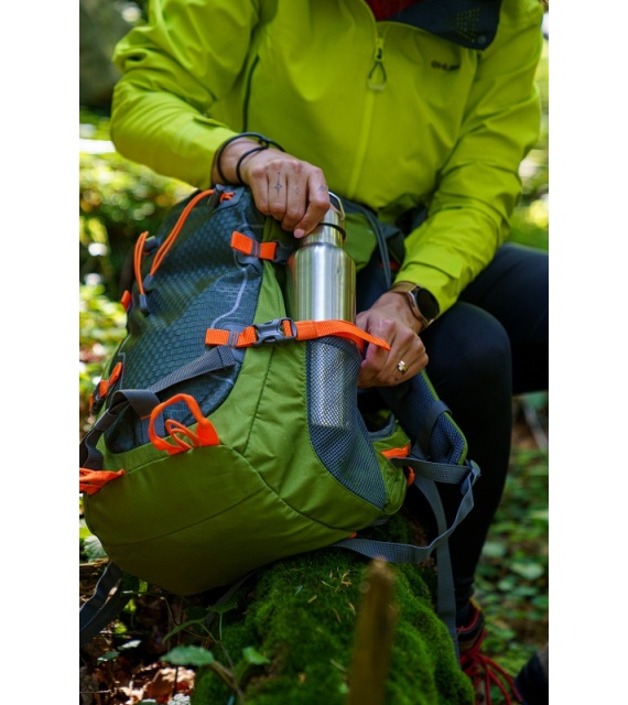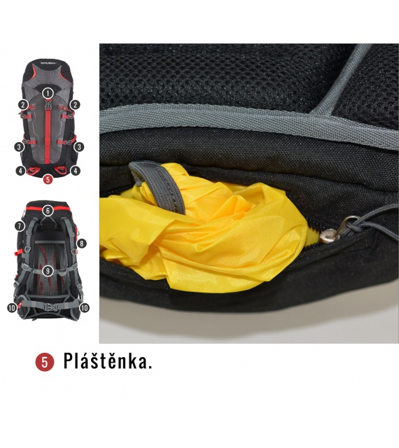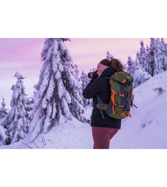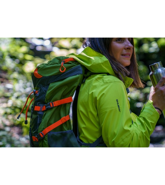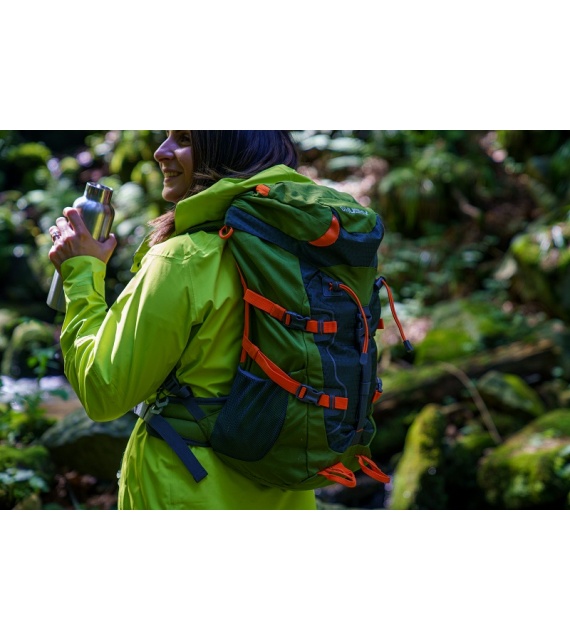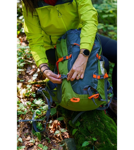 Ausstattung des Scape-Rucksacks: NBS-Rückensystem mit Duralumin-Verstärkungen, atmungsaktive Polsterung an anatomisch geformten Schulter- und Hüftgurten, 1 Hauptfach mit zusätzlichem Seitenzugang, seitliche Netztaschen, seitliche Kompressionsriemen, Brust- und Hüftgurt, wasserdichte Reißverschlüsse, Halterungen für Trekkingstöcke oder andere Ausrüstung, elastische Schlaufen für Ausrüstung am Deckel, Vorbereitung für Wassersack, Regenhülle, reflektierende Elemente.