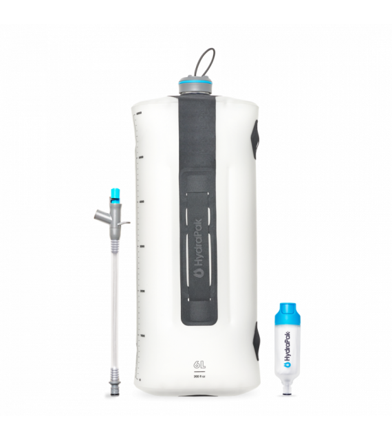 Großvolumiger Beutel mit Filter von der Marke Hydrapak zum Transportieren und Lagern von Wasser. Er ist die ideale Lösung beim Camping mit mehreren Personen, für mehrtägige Wanderungen mit Übernachtungen im Zelt. Er umfasst einen Filter, der das Wasser von unerwünschten Mikroben und Bakterien befreit, sowie einen Dosierhahn, mit dem Sie Flaschen mit verschiedenen Verschlüssen bequem füllen, sich die Hände waschen oder Geschirr spülen können. Der Beutel hat zwei feste Schlaufen an der Seite zur Befestigung am Rucksack, eine Schlaufe an der Unterseite zum Aufhängen, zum Beispiel an einem Ast, und eine mittlere Schlaufe zum Tragen und Befüllen. Nach dem Entleeren rollen Sie ihn klein zusammen und packen ihn in die beiliegende Hülle.