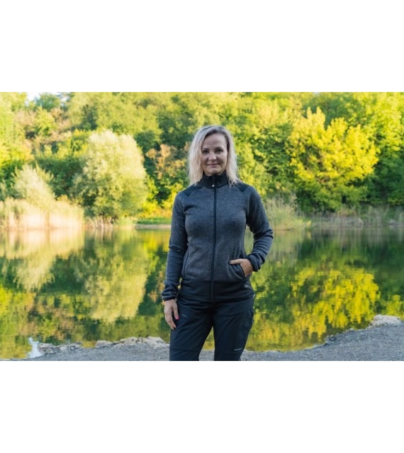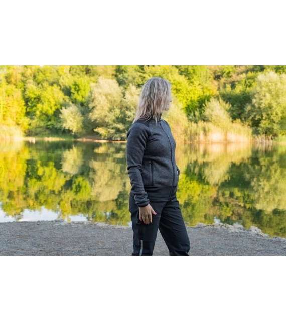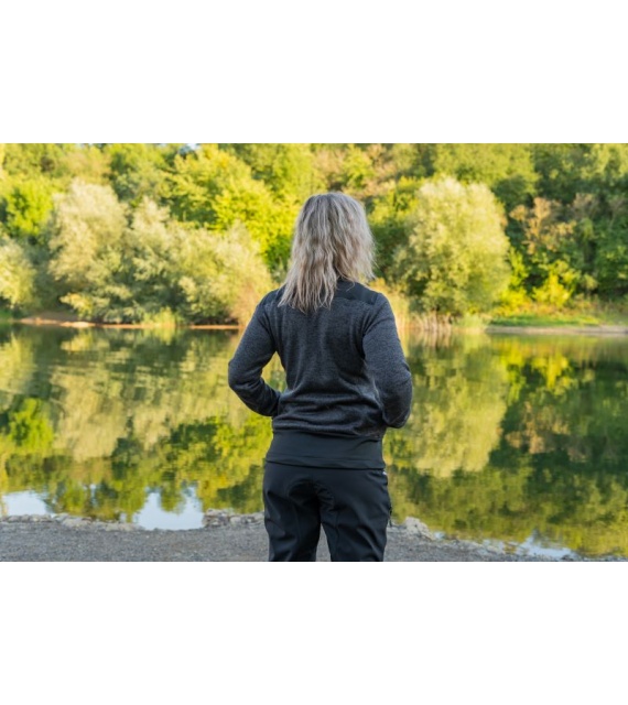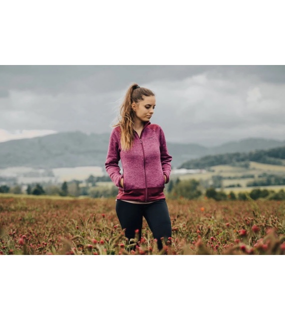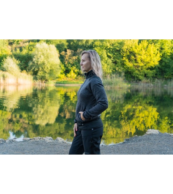 Dickerer Damenpullover mit Reißverschluss, geeignet für verschiedene Outdoor-Aktivitäten wie Wandern.
