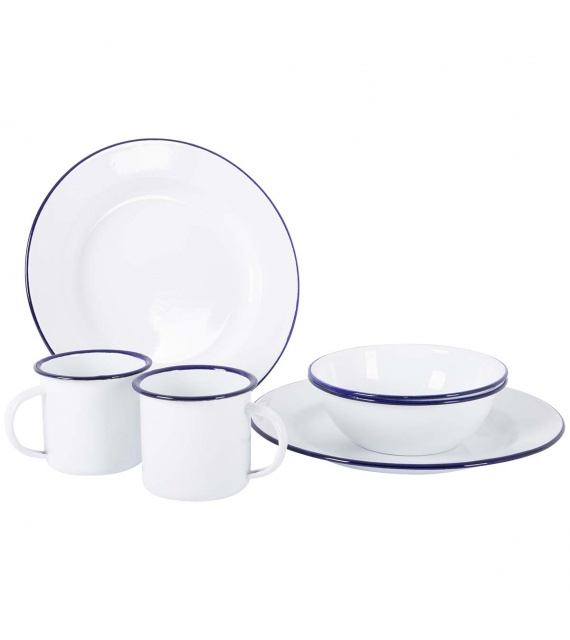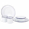 Robustes 6-teiliges Geschirr-Set aus Stahl mit blauer Kante. Das Set ist mit einer harten Emailleschicht versehen, die zusätzliche Hygiene und Festigkeit bietet. Emaille ist zudem hitzebeständig und langlebig. Dieses Set ist für 2 Personen geeignet und besteht aus 2 Tellern ? 26 cm, 2 Schalen 700 ml und 2 Tassen 370 ml.