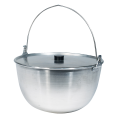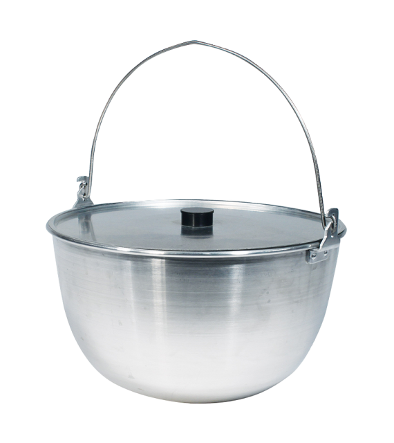 Kessel mit flachem Boden und einem Volumen von 10,0 l. Der Kessel besteht aus hochwertigem Aluminium, das für den Kontakt mit Lebensmitteln geeignet ist. Der Kessel ist mit einem Klappgriff aus Edelstahl ausgestattet.