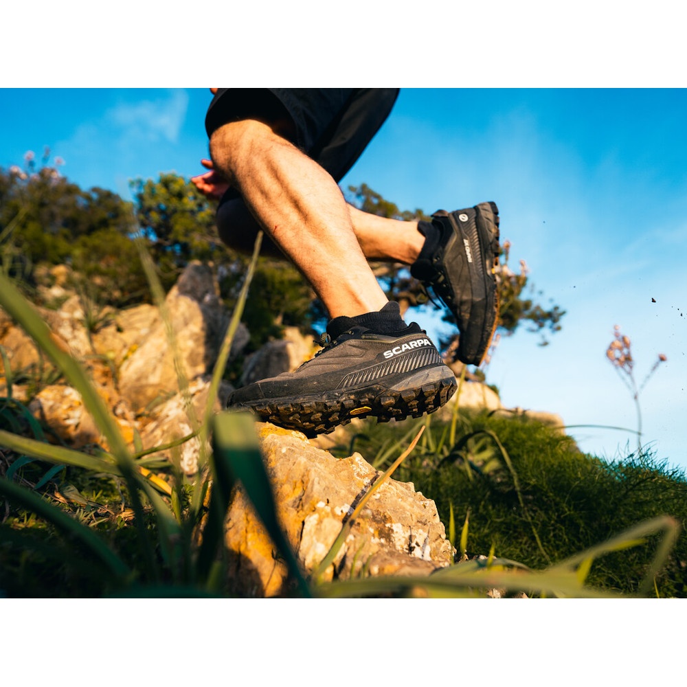 Die am Schaft verwendete EXOskeleton-Technologie mag auf den ersten Blick wie ein Designelement erscheinen, ist jedoch eine seitliche Verstärkung des Schafts für Stabilität und Halt bei der Bewegung im Gelände. Die Vibram® MegaGrip-Laufsohle verfügt über Kletterzonen im Zehenbereich und ein Bremssystem im hinteren Bereich, das für Stabilität und Halt sorgt. Innovative Form, breit und ergonomisch geformt im Zehenbereich, so dass der Schuh die Fußform besser nachbildet.