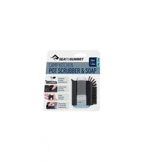 Handflächengroßer Topfschrubber aus Polypropylen mit Nylonborsten, integriertem Schaber und 50ml Flasche mit biologisch abbaubarem Wilderness Wash Waschmittel.