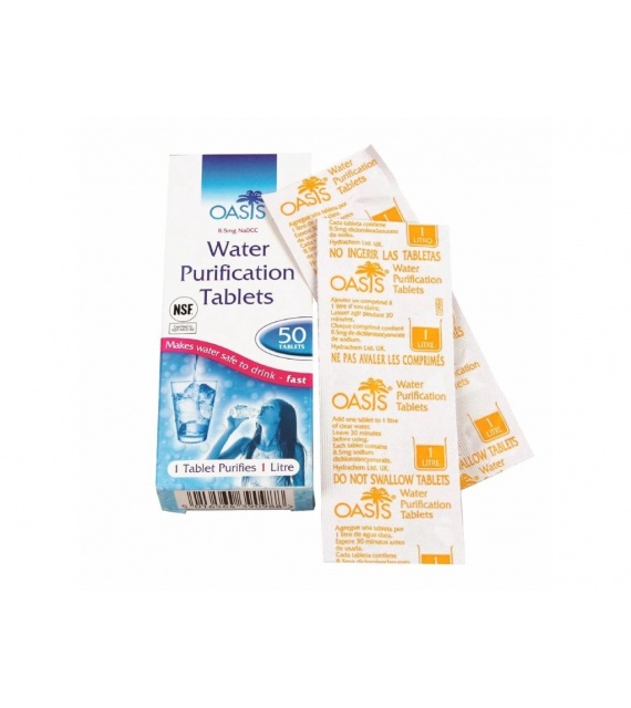 OASIS sind Wasserreinigungstabletten auf Chlorbasis für Reisen und Abenteuer. Oasis-Tabletten töten Bakterien, Bakteriensporen, Zysten, Algen, Pilze, Urtierchen und Viren ab und sind besonders tödlich für Entamoeba Histolytica. Oasis Water Purification Tabletten töten unter anderem im Wasser übertragene Organismen ab.